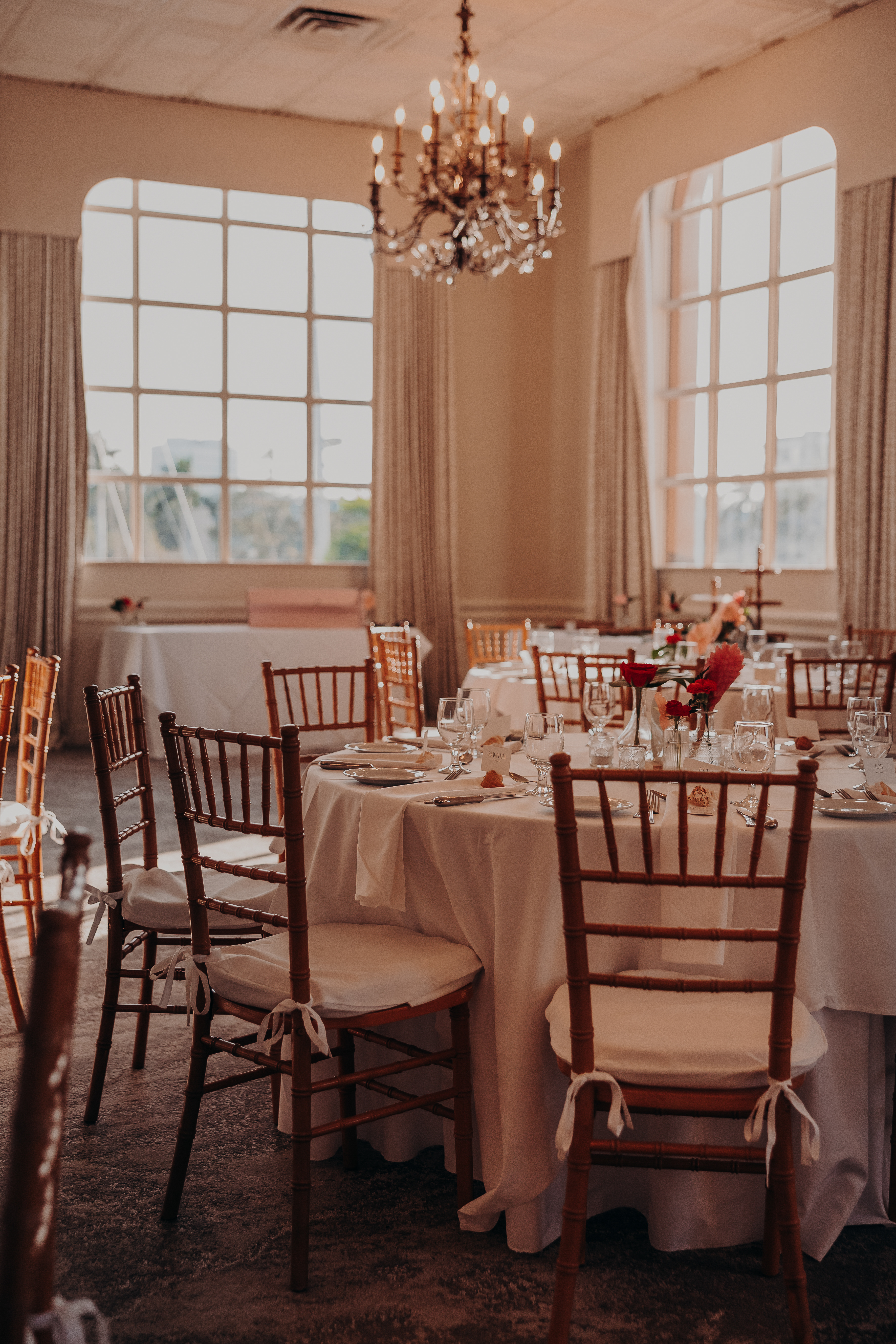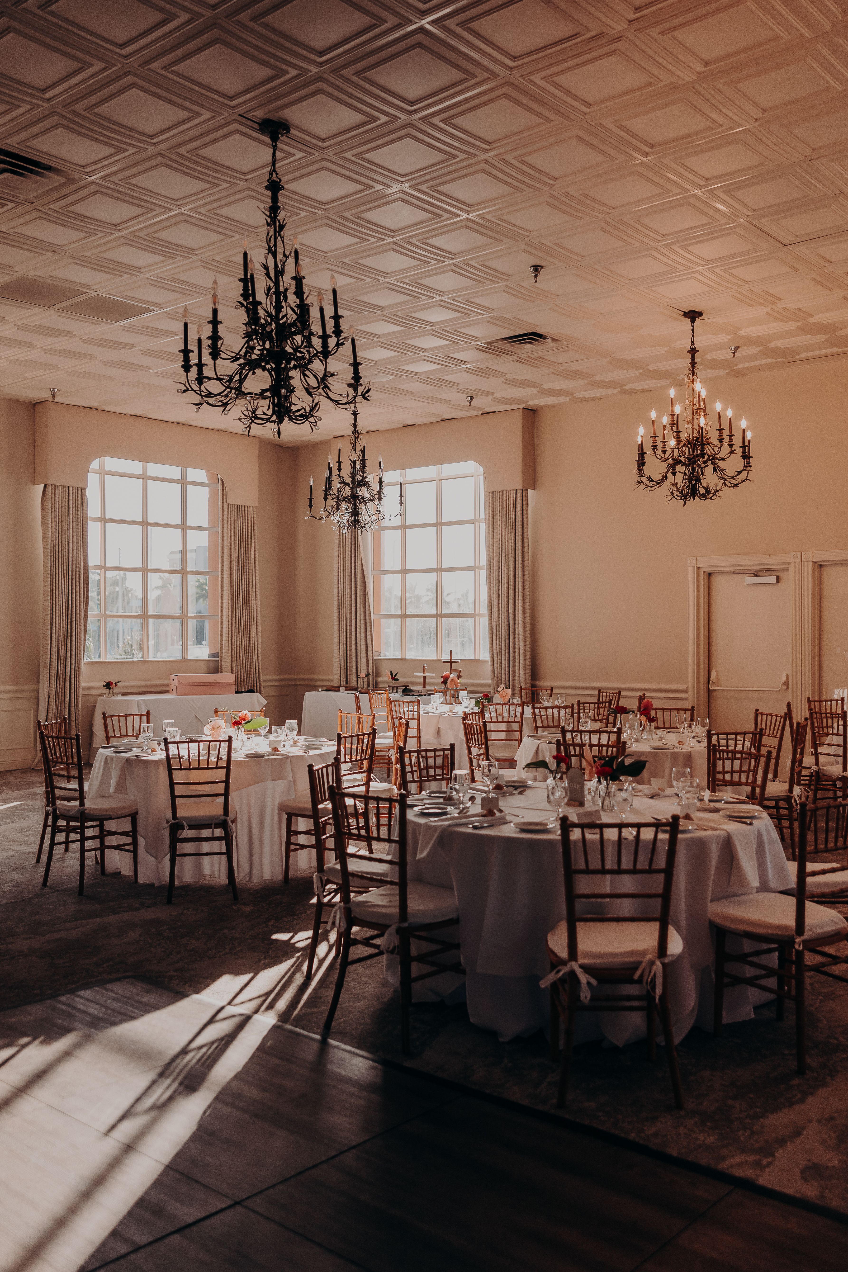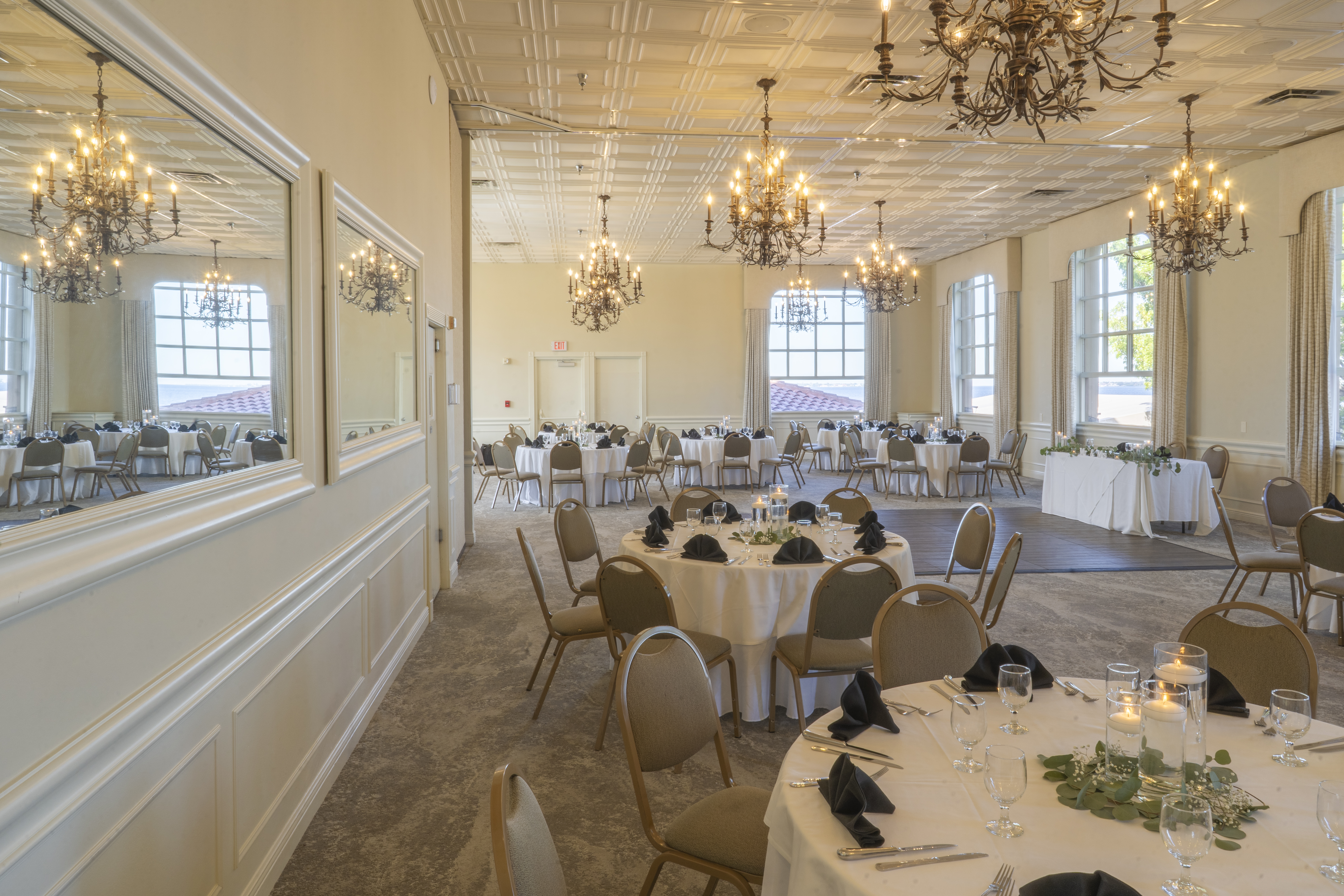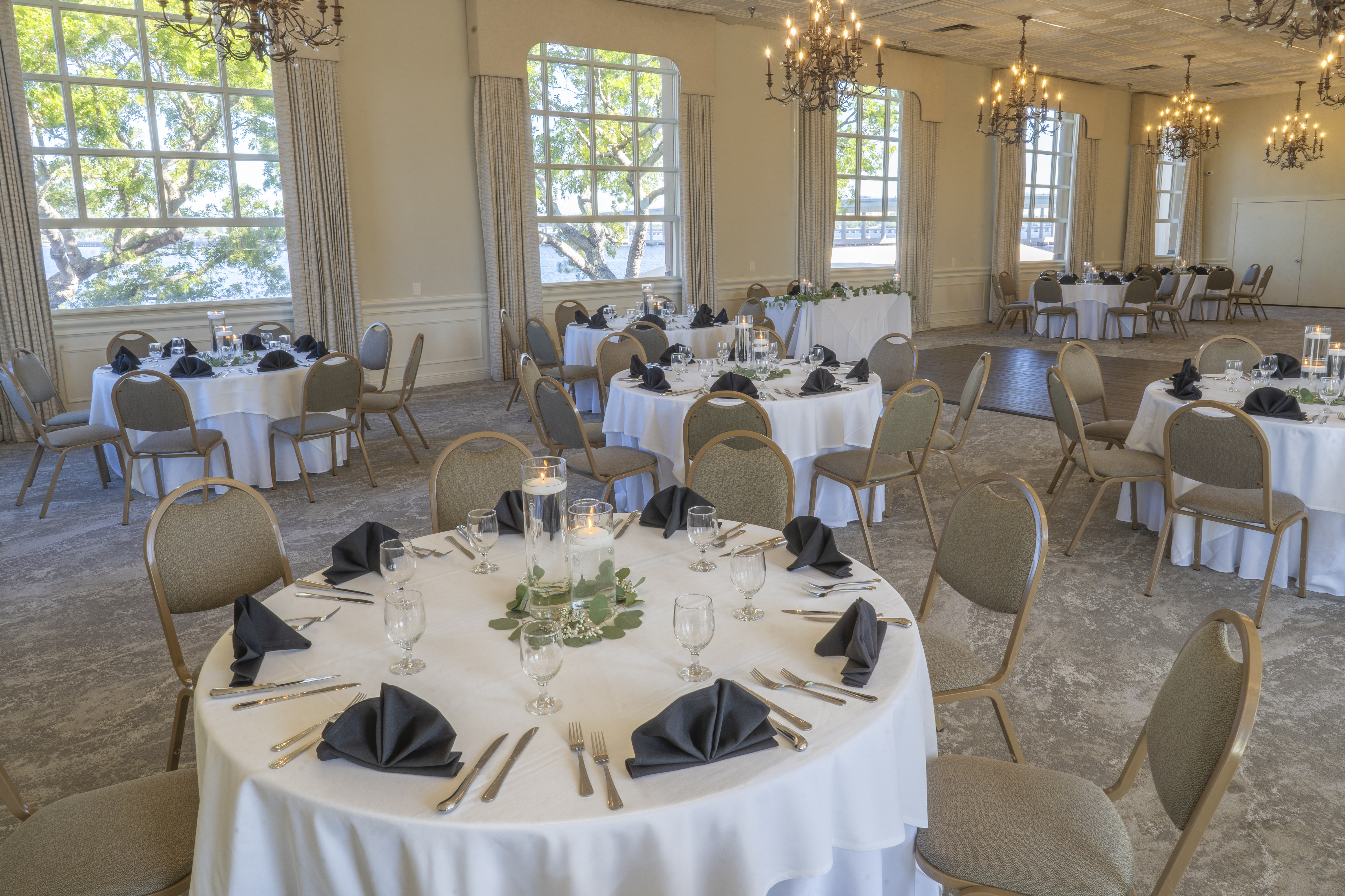 Elegant waterfront ballroom with chandeliers and river sunset views. Ideal for large weddings and corporate events.