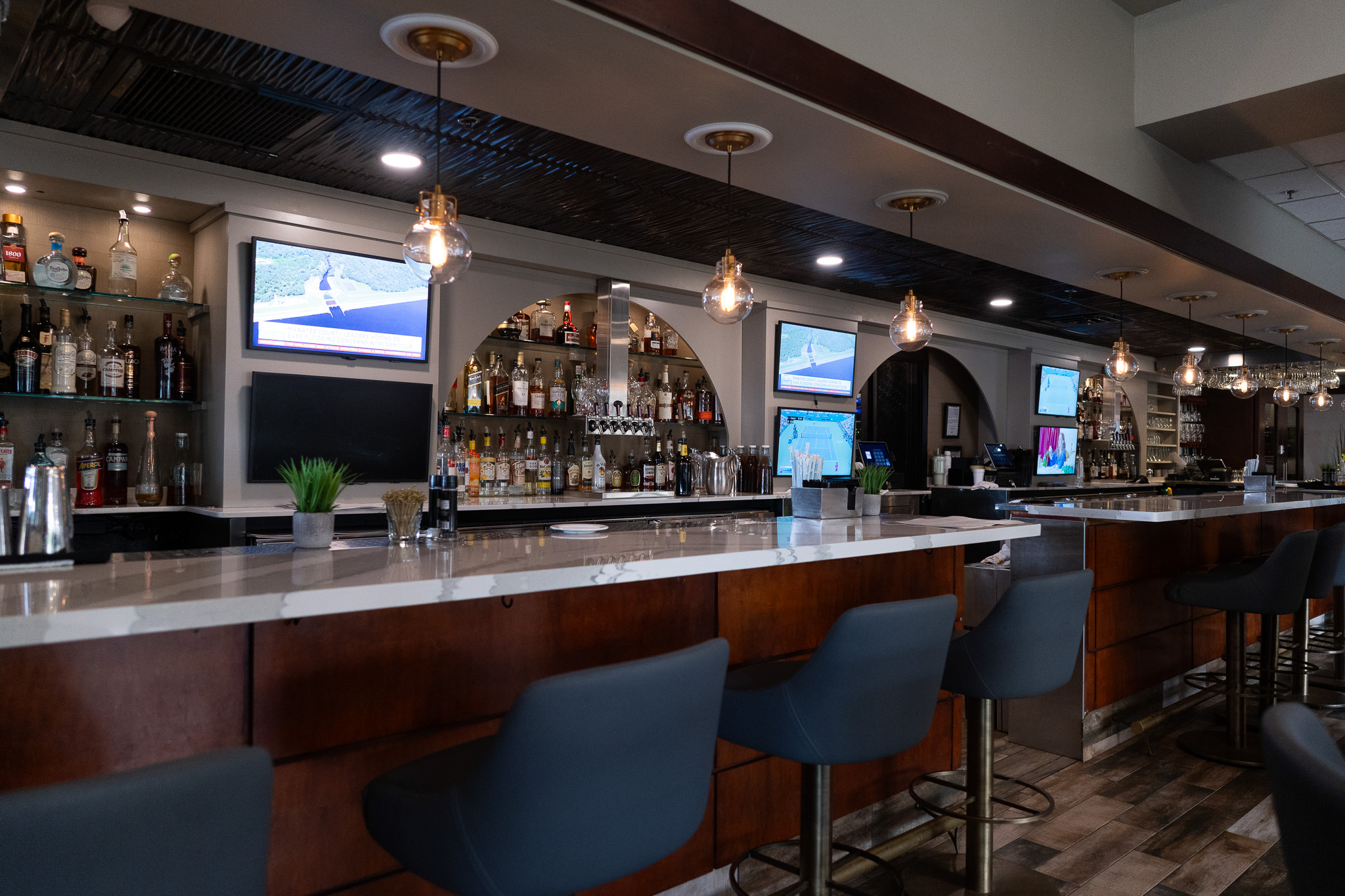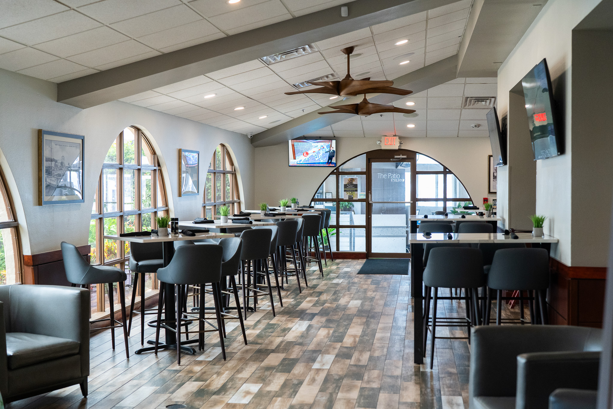 A spacious waterfront setting with high-top tables and bar-style seating, ideal for happy hours, networking events, and cocktail receptions.